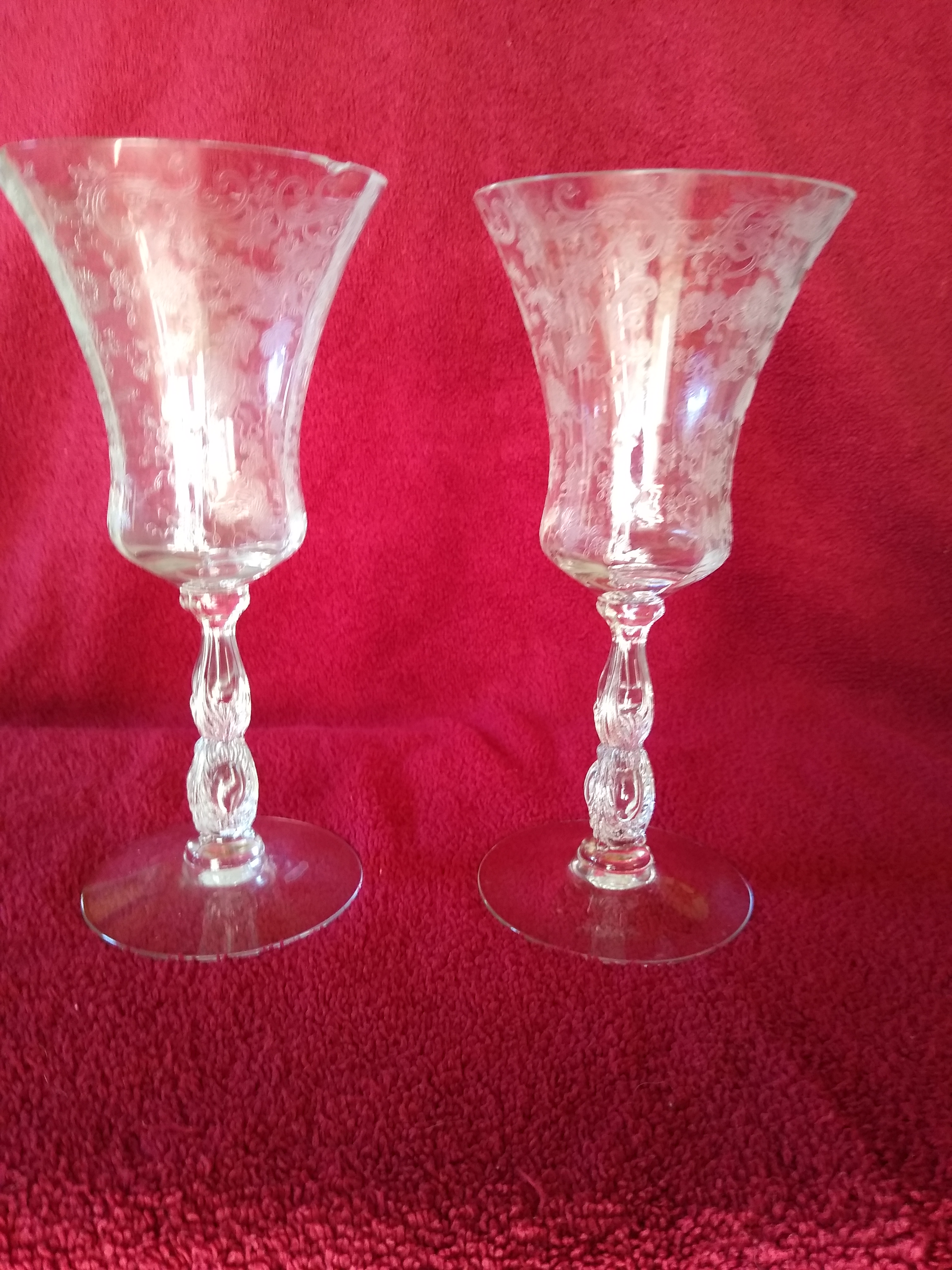 There are ten of the Tiffin-Franciscan water goblets that I have seen being offered for as much as $45 per stem. I will only sell the set. I have no idea of the value or origin of